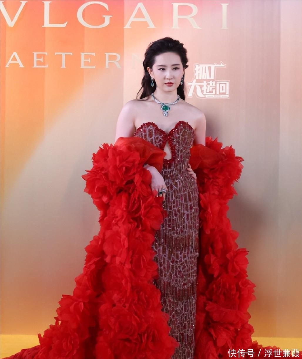 那件刷屏级正红抹胸礼服配素雅披肩,颈间祖母绿宝石光芒万丈,却仍难掩她眼波流转间的明艳生机;